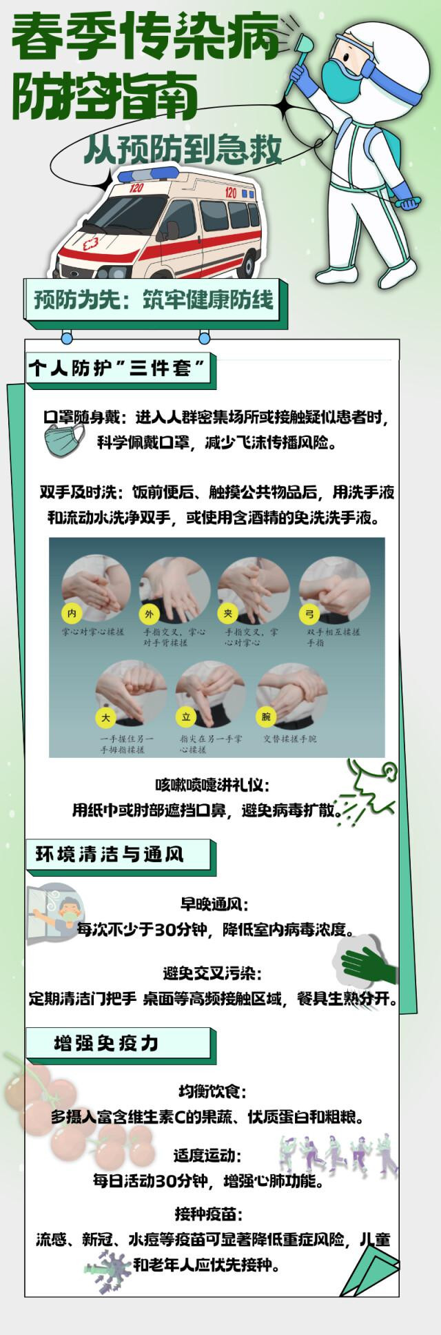 春季气温多变,空气干燥,是流感、诺如病毒、手足口病等呼吸道和消化道传染病的高发期。如何科学预防?何时又需紧急就医?下图从“预防”到“急救”各环节进行全流程解析,为您的健康保驾护航。